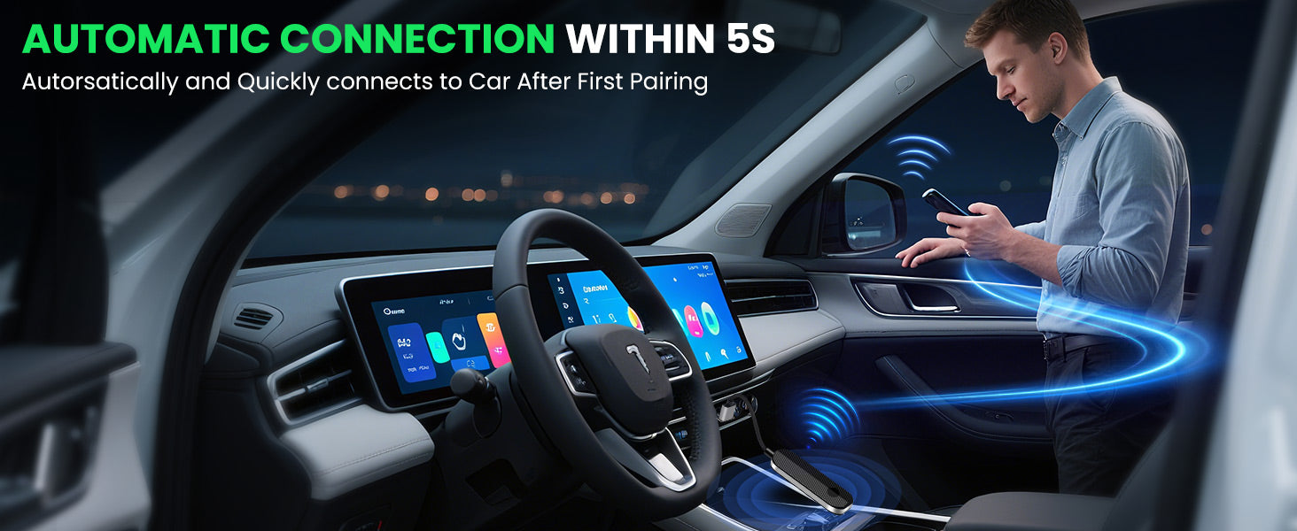 【Ultra-Compact, Zero Clutterr】Ditch messy cables and bulky devices! Our wireless CarPlay adapter features a thumb-sized design that tucks neatly into your car's USB port—no wires, no bulk, just clean aesthetics. Its minimalist profile blends seamlessly with modern interiors while maintaining a sleek, professional look