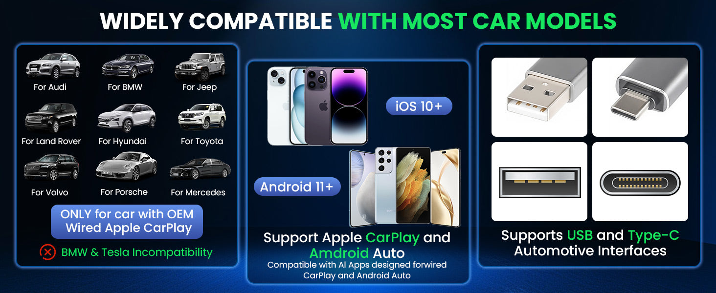 This wireless adapter is fully compatible with 98% of factory-supported CarPlay vehicles and supports iPhones running iOS 10 and above and Android phones running Android 11 and above.