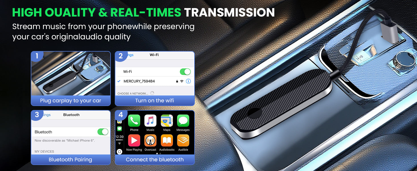 Our high-end wireless CarPlay adapter eliminates signal interruptions, ensuring you stay connected and uninterrupted while driving. Enjoy instant response and zero latency for smooth navigation, music control, and calls.
