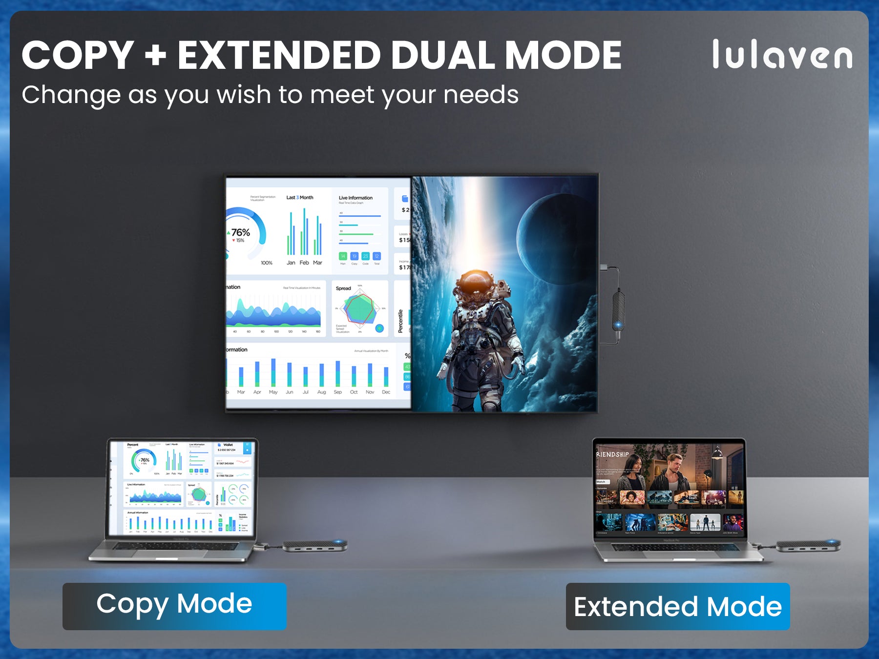 Instant dual display mode switching (mirroring/extended) without Wi-Fi or drivers, ensuring quick connectivity for versatile presentations and multitasking